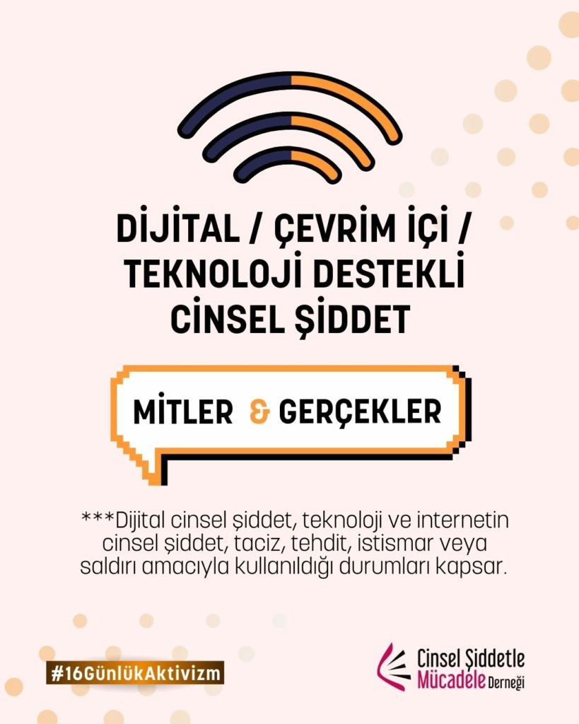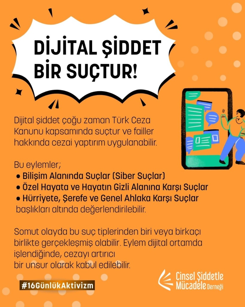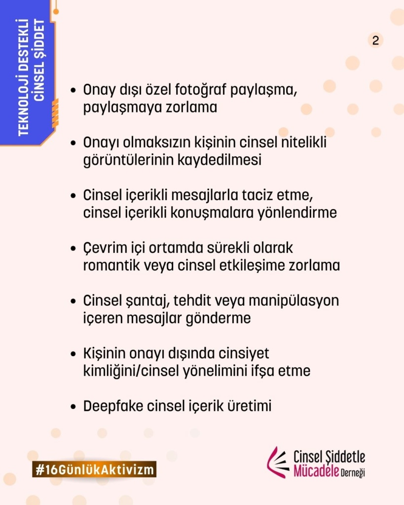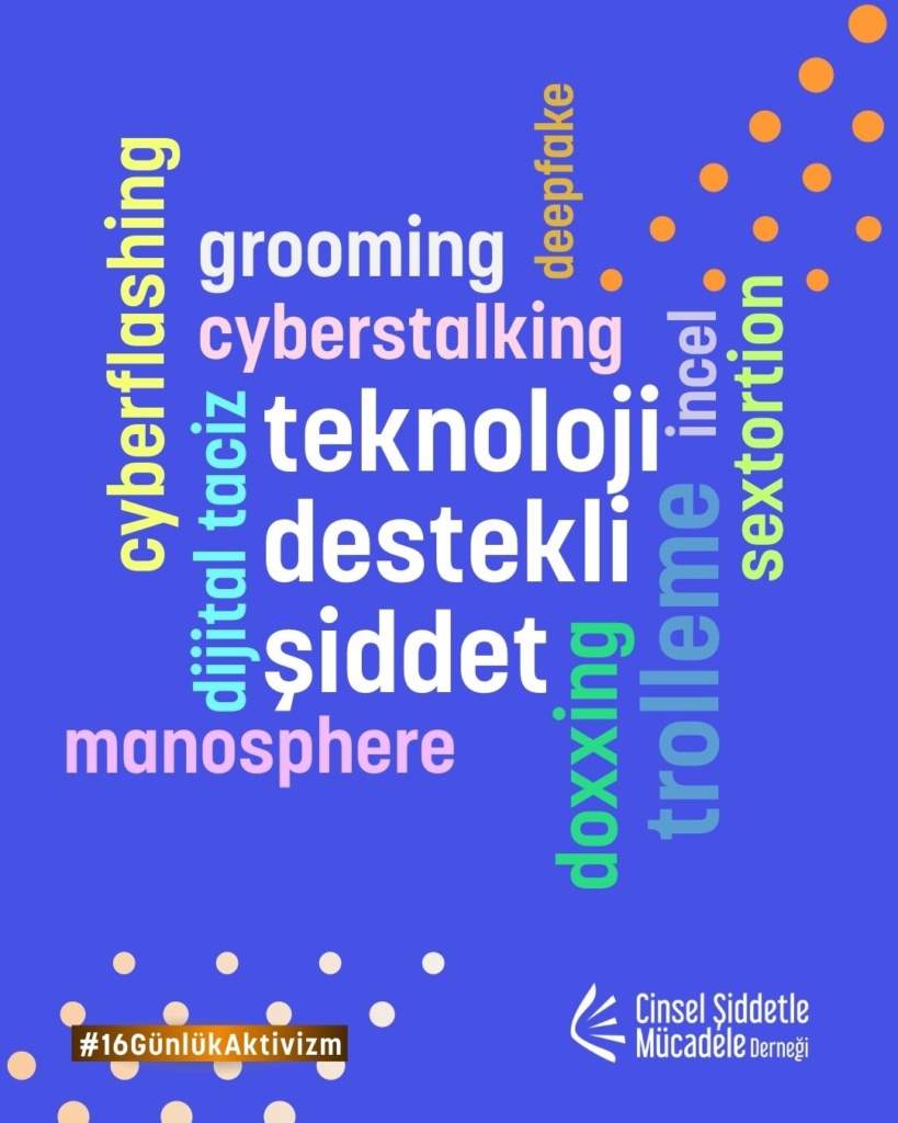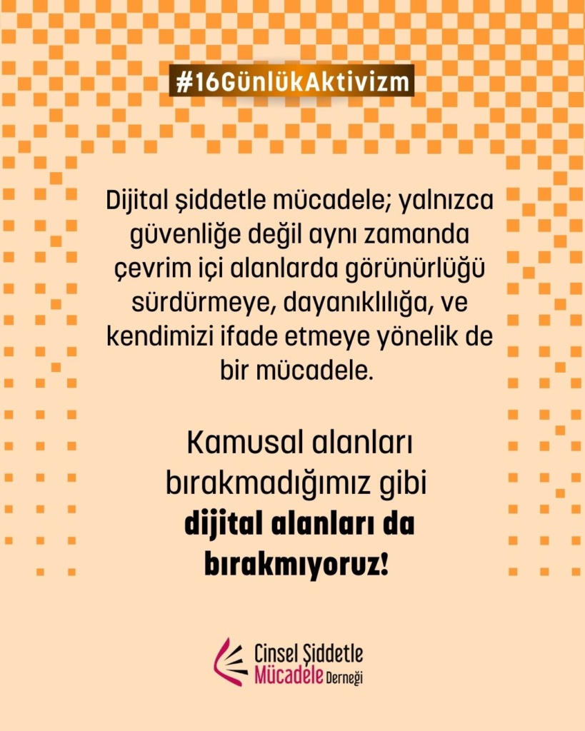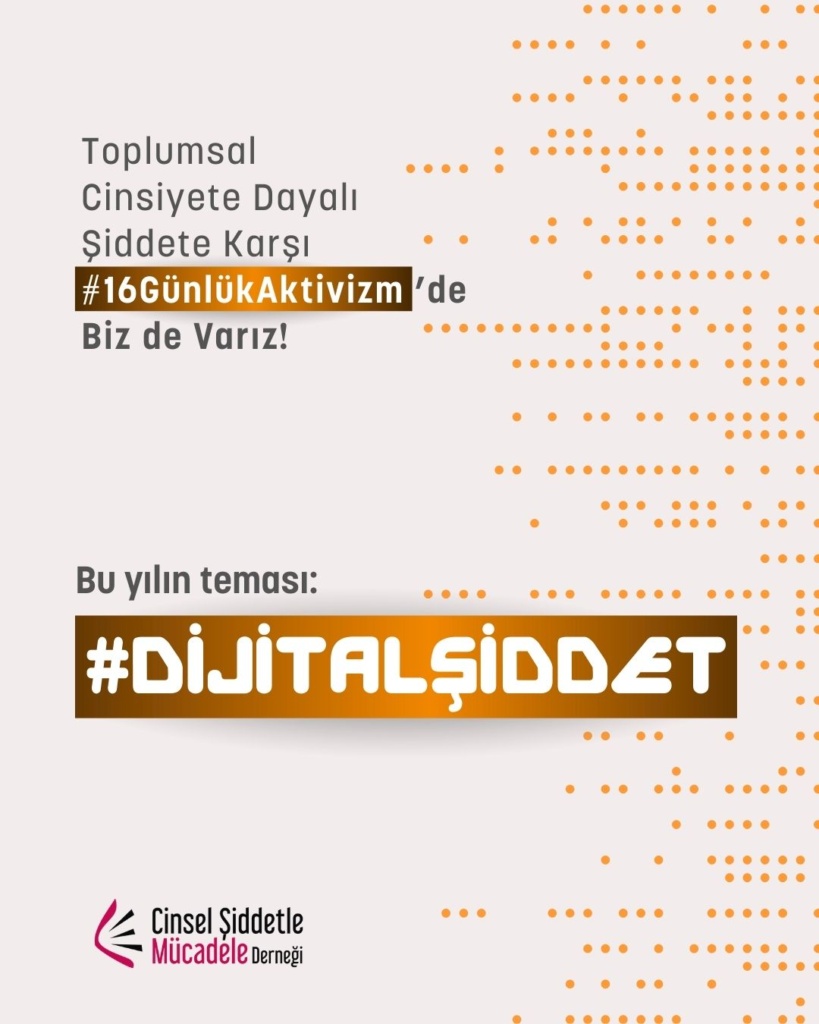 16 Günlük Aktivizm 2025 yılı teması UN Women ve UNFPA ortaklığında, “Kadına ve kız çocuklarına karşı dijital şiddete son ver. Noktayı Koy!” sloganıyla “Dijital Şiddet” oldu. Bu yıl biz de çevrim içi cinsel şiddet, dijital şiddet, teknoloji destekli cinsel şiddet, çevrimiçi partner şiddeti, cinsel şantaj, grooming ve nefret söylemi gibi toplumsal cinsiyete dayalı dijital şiddetin pek çok türüne yönelik farkındalığı artırmak üzere kampanyaya katılım sağladık.
