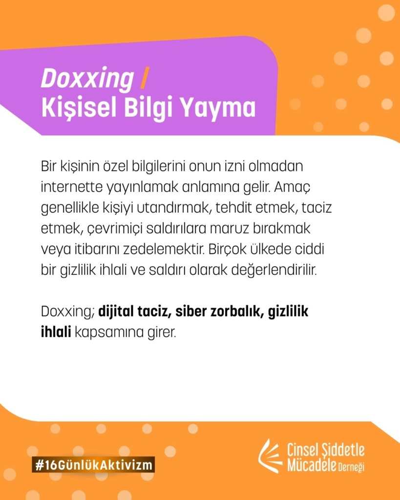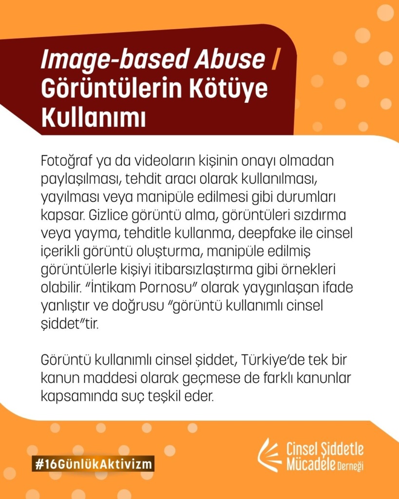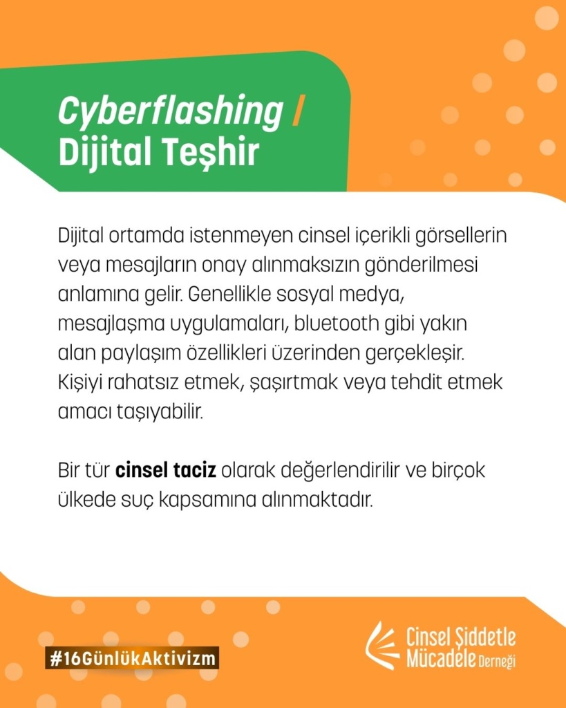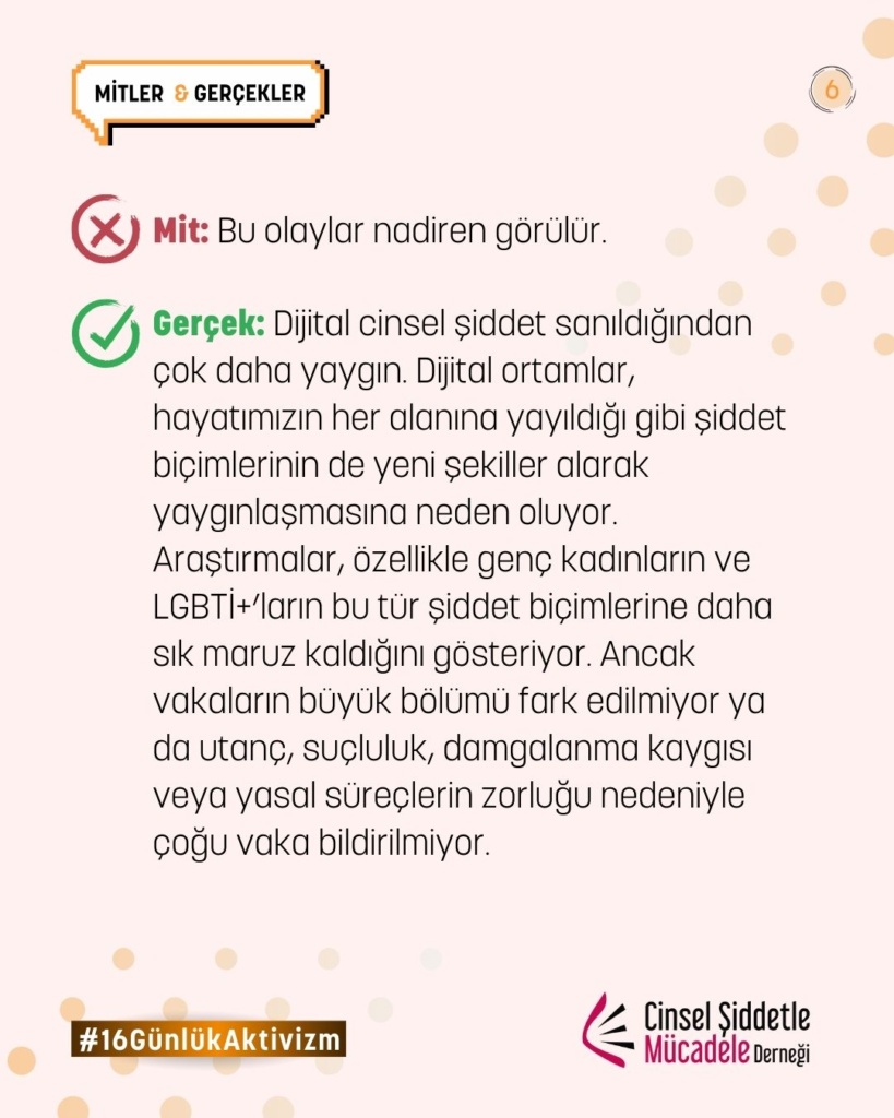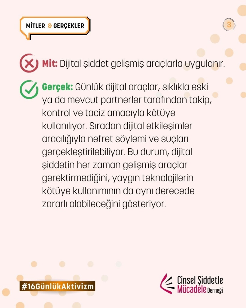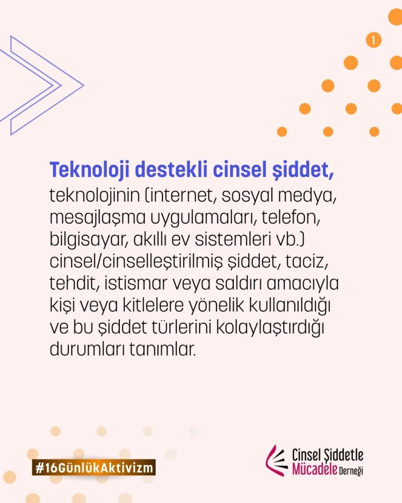 16 Günlük Aktivizm 2025 yılı teması UN Women ve UNFPA ortaklığında, “Kadına ve kız çocuklarına karşı dijital şiddete son ver. Noktayı Koy!” sloganıyla “Dijital Şiddet” oldu. Bu yıl biz de çevrim içi cinsel şiddet, dijital şiddet, teknoloji destekli cinsel şiddet, çevrimiçi partner şiddeti, cinsel şantaj, grooming ve nefret söylemi gibi toplumsal cinsiyete dayalı dijital şiddetin pek çok türüne yönelik farkındalığı artırmak üzere kampanyaya katılım sağladık.