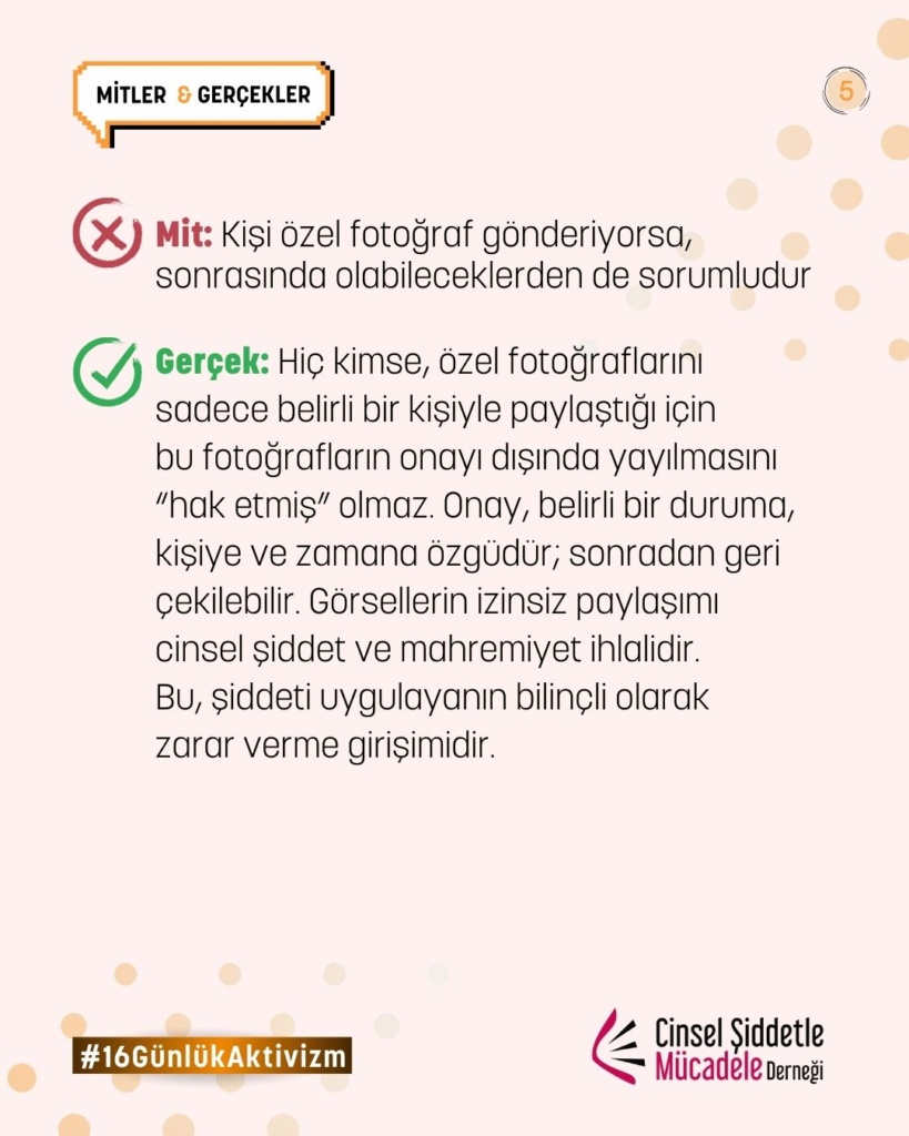 Gerçek: Hiç kimse, özel fotoğraflarını sadece belirli bir kişiyle paylaştığı için bu fotoğrafların onayı dışında yayılmasını “hak etmiş” olmaz. Onay, belirli bir duruma, kişiye ve zamana özgüdür; sonradan geri çekilebilir. Görsellerin izinsiz paylaşımı cinsel şiddet ve mahremiyet ihlalidir. Bu, şiddeti uygulayanın bilinçli olarak zarar verme girişimidir.