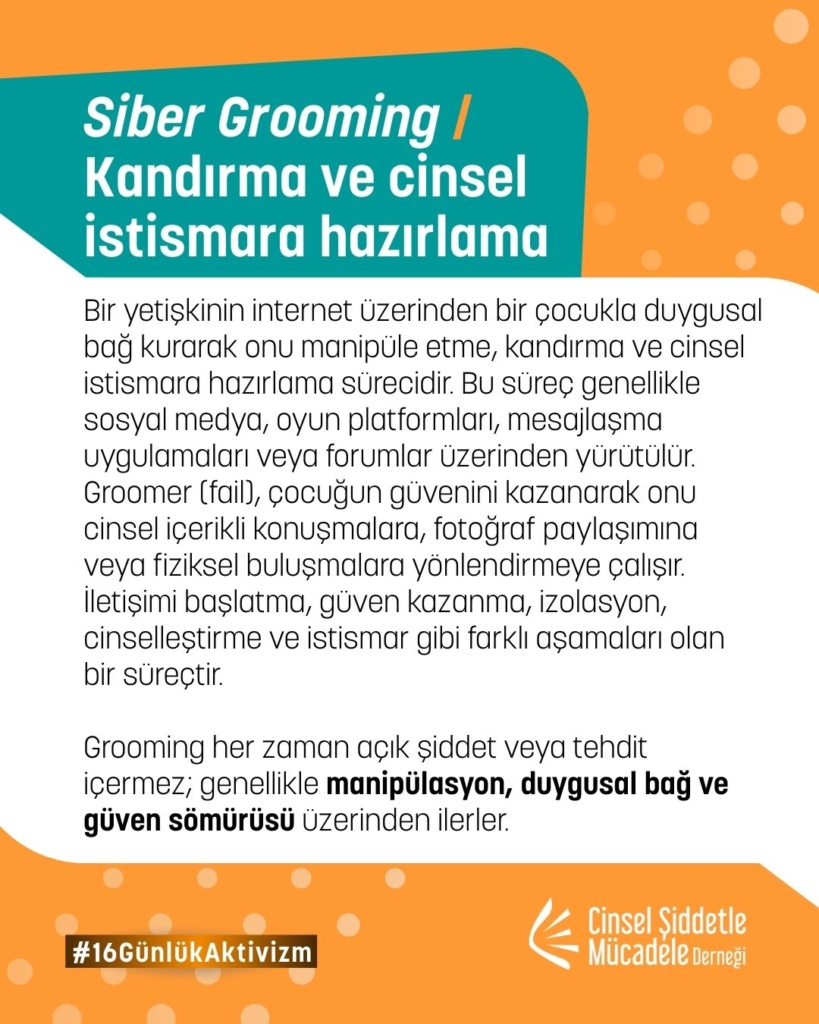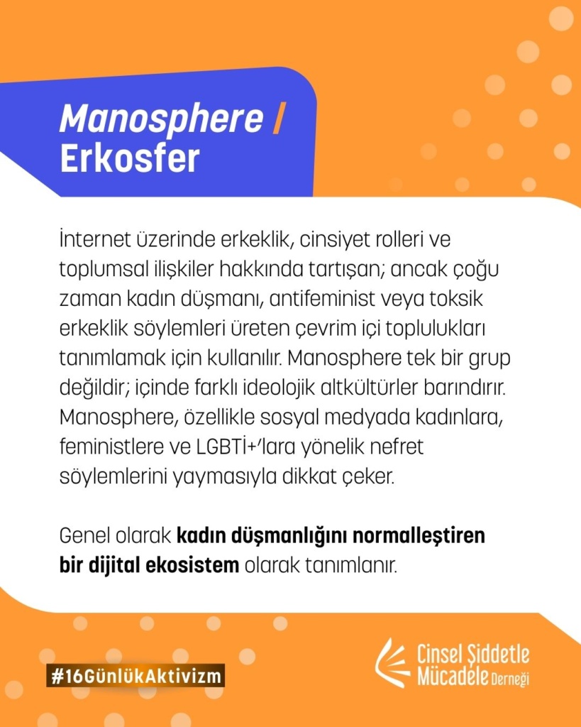 Dijital alan, şiddetin yeni biçimleriyle kadınları, çocukları ve LGBTİ+’ları hedef alan geniş bir alan hâline geliyor. Bu postta; manosphere/erkosfer söylemlerinden başlayarak grooming, cinsel içerikli şantaj (sextortion), siber teşhir (cyberflashing), doxxing ve görüntü kullanımlı cinsel şiddet gibi teknoloji destekli şiddet türlerine yer veriyoruz. Amacımız; çevrim içi şiddetin nasıl işlediğini görünür kılmak, herkesin dijital alanda karşılaşabileceği riskler hakkında farkındalık yaratmak ve güvenli internet kullanımını güçlendirmek.