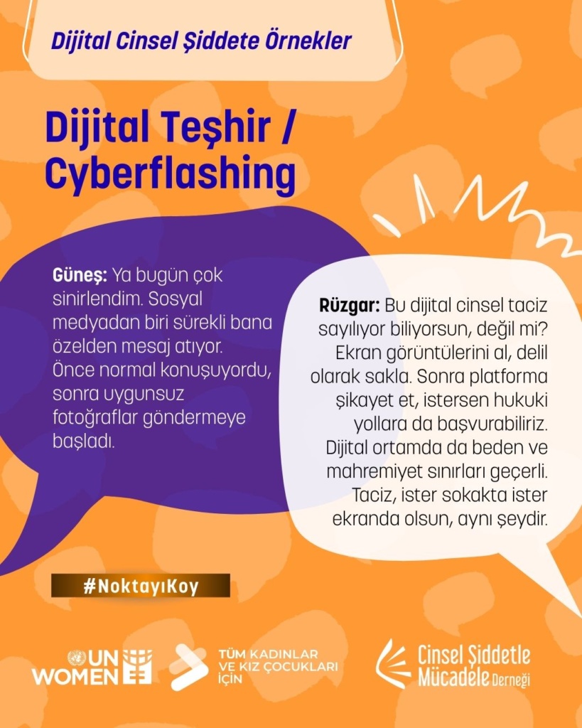Dijital şiddetle mücadelenin ilk adımı farkındalık. Bu postta; dijital / çevrimiçi flört şiddeti, dijital cinsel şantaj, dijital teşhir gibi teknoloji destekli şiddet türlerine örnek diyaloglara yer veriyoruz. Daha fazlası için UN Women ve UNFPA tarafından hazırlanan rehbere bakabilirsiniz.