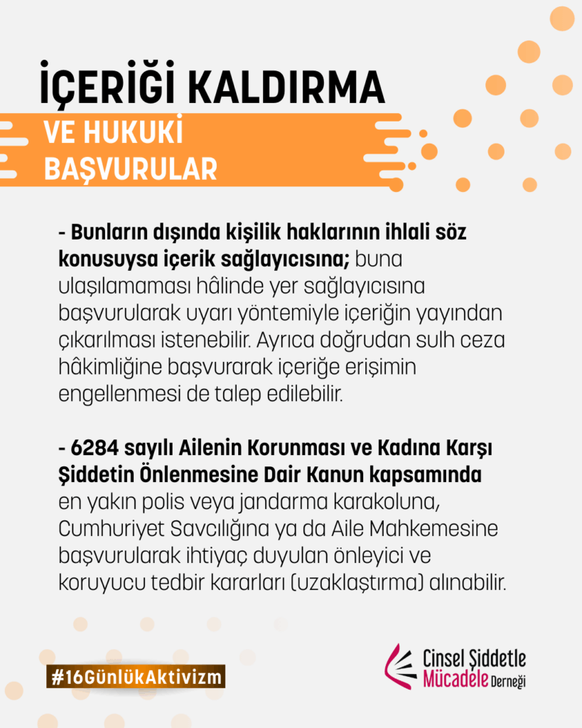 – Bunların dışında kişilik haklarının ihlali söz konusuysa içerik sağlayıcısına; buna ulaşılamaması hâlinde yer sağlayıcısına başvurularak uyarı yöntemiyle içeriğin yayından çıkarılması istenebilir. Ayrıca doğrudan sulh ceza hâkimliğine başvurarak içeriğe erişimin engellenmesi de talep edilebilir.