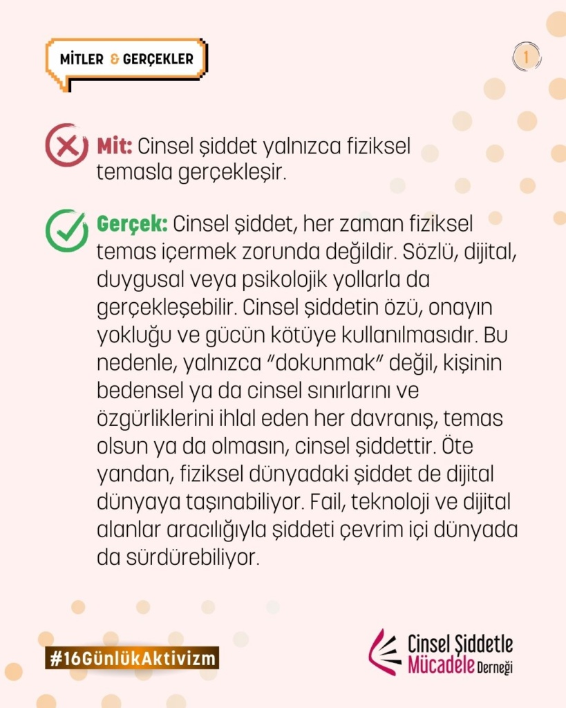 Gerçek: Cinsel şiddet, her zaman fiziksel temas içermek zorunda değildir. Sözlü, dijital, duygusal veya psikolojik yollarla da gerçekleşebilir. Cinsel şiddetin özü, onayın yokluğu ve gücün kötüye kullanılmasıdır. Bu nedenle, yalnızca “dokunmak” değil, kişinin bedensel ya da cinsel sınırlarını ve özgürliklerini ihlal eden her davranış, temas olsun ya da olmasın, cinsel şiddettir. Öte yandan, fiziksel dünyadaki şiddet de dijital dünyaya taşınabiliyor. Fail, teknoloji ve dijital alanlar aracılığıyla şiddeti çevrim içi dünyada da sürdürebiliyor.