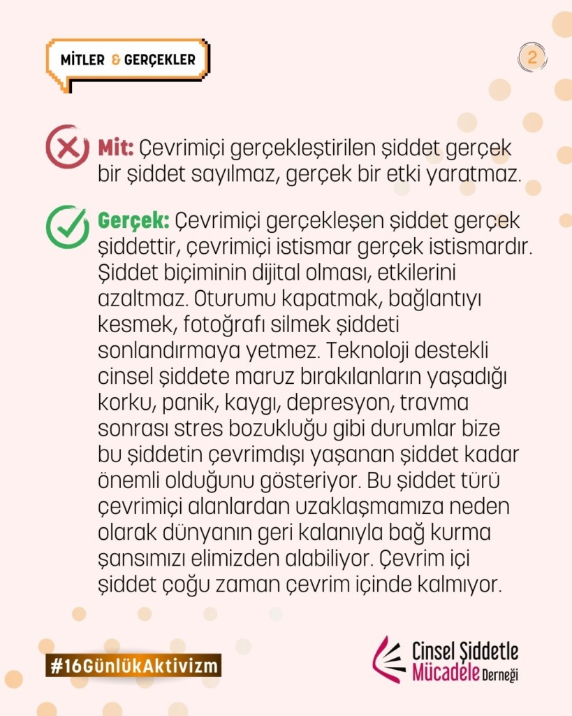 Gerçek: Çevrim içi gerçekleşen şiddet gerçek şiddettir, çevrim içi istismar gerçek istismardır. Şiddet biçiminin dijital olması, etkilerini azaltmaz. Oturumu kapatmak, bağlantıyı kesmek, fotoğrafı silmek şiddeti sonlandırmaya yetmez. Teknoloji destekli cinsel şiddete maruz bırakılanların yaşadığı korku, panik, kaygı, depresyon, travma sonrası stres bozukluğu gibi durumlar bize bu şiddetin çevrimdışı yaşanan şiddet kadar önemli olduğunu gösteriyor. Bu şiddet türü çevrim içi alanlardan uzaklaşmamıza neden olarak dünyanın geri kalanıyla bağ kurma şansımızı elimizden alabiliyor. Çevrim içi şiddet çoğu zaman çevrim içinde kalmıyor.